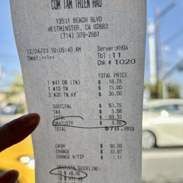 We came during tet weekend, so it was extremely crowded! Major props to the whole restaurant for keeping everything organized and clean. We had to wait about 30 minutes, but again, they were basically the only com tam restaurant open nearby, so we expected a lot of people. Everyone was nice, and the food came out right away. The meat is flavorful! It's top on my OC com tam list now :)